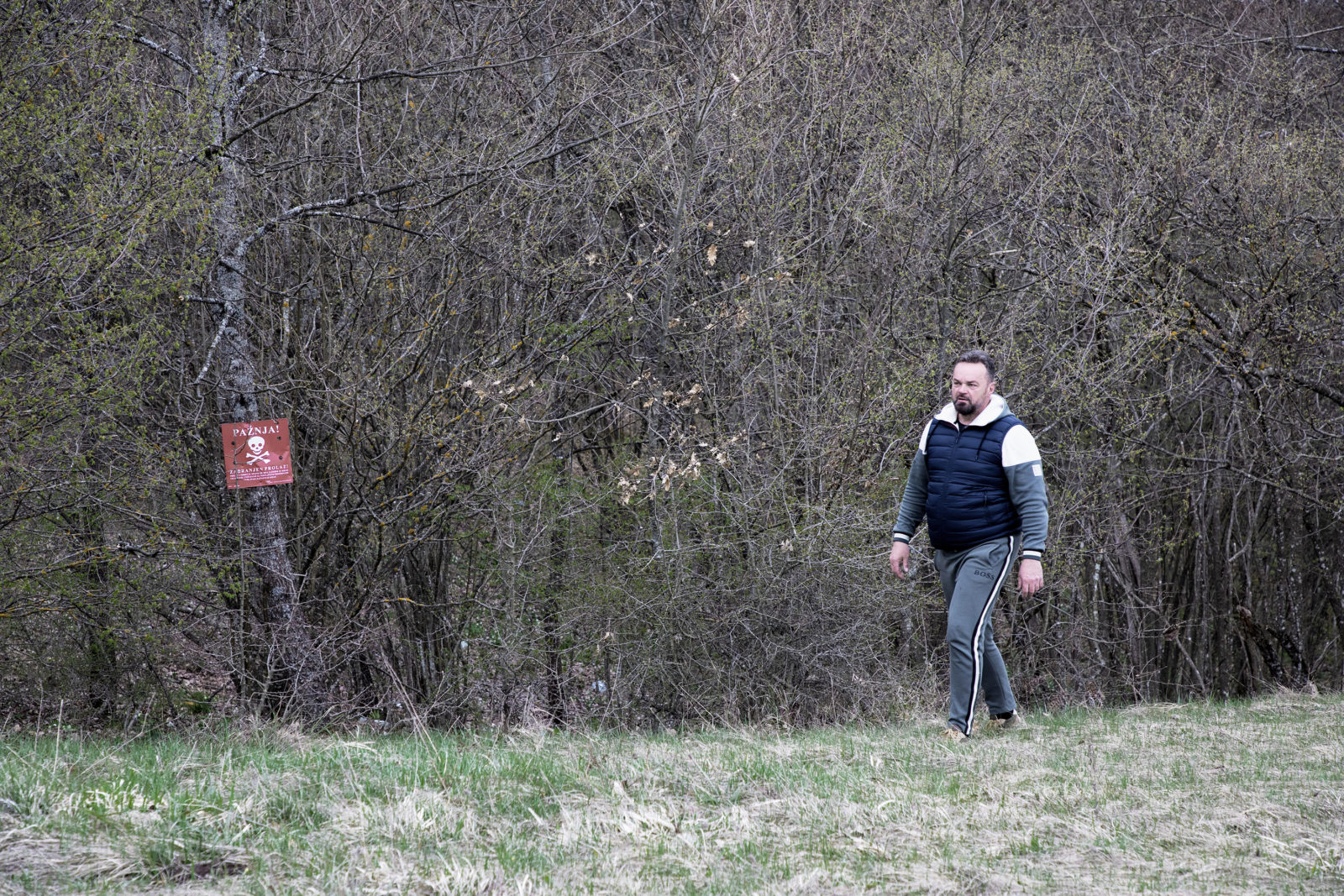 Lipa, Bosnia and Herzegovina, April 15, 2025: Nedzad, a local businessman and veteran from the 1990s war in Bosnia, walks along the edge of a mine-suspected area near Lipa migrant camp.