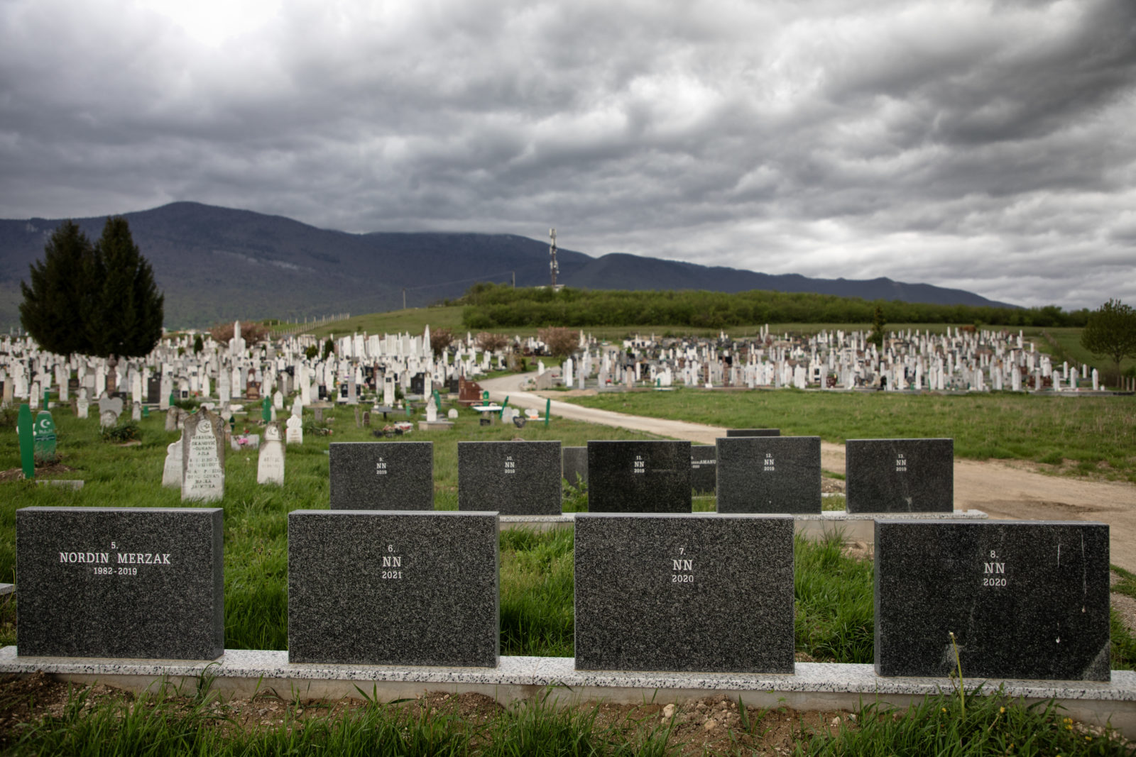 Bihać, Bosnia and Herzegovina, 17 April, 2025: In a corner of the Bihać cemetery, several tombstones for migrants and people found dead near the border are marked ‘NN’ – Latin for ‘nomen nescio’ – I do not know the name