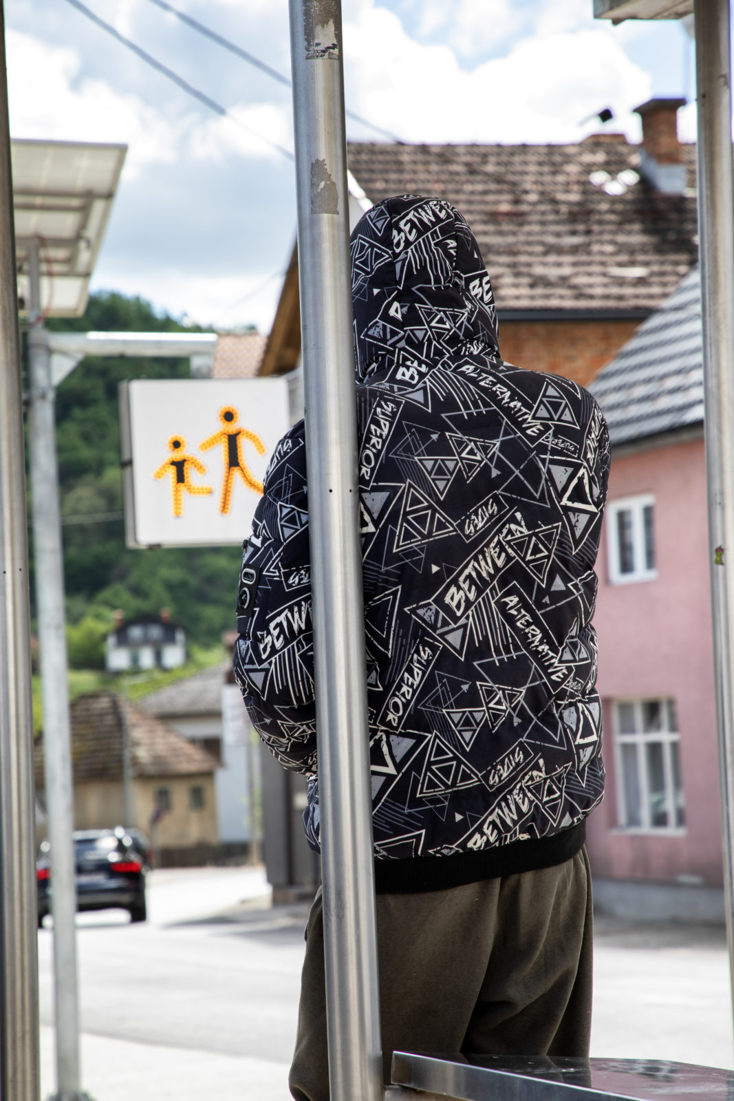 Vrnograč, Bosnia and Herzegovina, April 19, 2025: A migrant rests by a bus stop near Velika Kladuša, waiting for a ride back to Lipa.