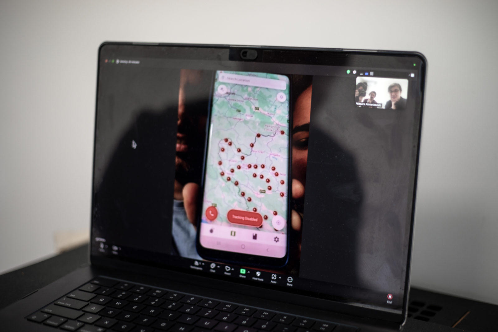 Bihać, Bosnia and Herzegovina, April 19, 2025: Josue and Adriana Rodriguez share a screenshot of a map they used to navigate out of Bosnia, months after fleeing Cuba. The red dots signify minefields.