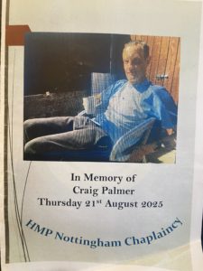 Craig’s cremation took place on 11 August. Not wanting it to go unmarked, John Seeney went and was allowed to say a few words. He told me he gave Craig’s coffin a little pat, as a goodbye from us all. Ten days later, Seeney and I organised a memorial for Craig inside Nottingham prison. Jodie Young, Tara Tan and about 20 of the current in mates were there.